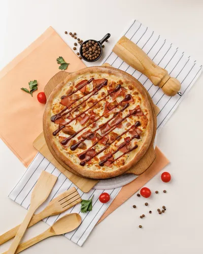 Состав: сыр моцарелла, бекон, ветчина, куриное филе, помидоры, соус Барбекю, сливочный соус