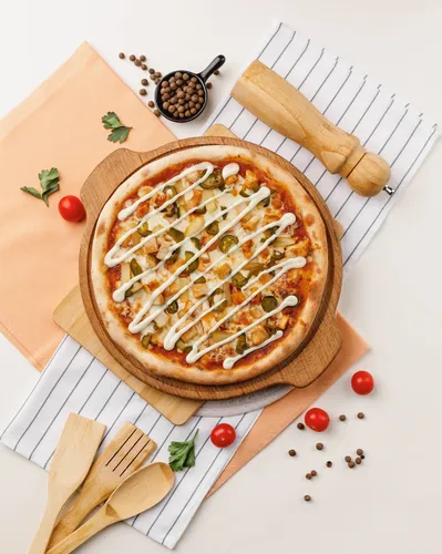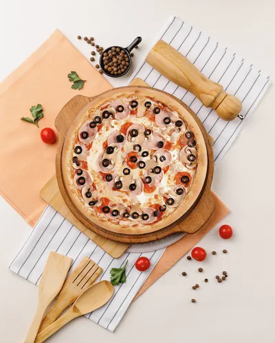 Состав: ветчина, пепперони, шампиньоны, маслины, сыр моцарелла, сливочный соус